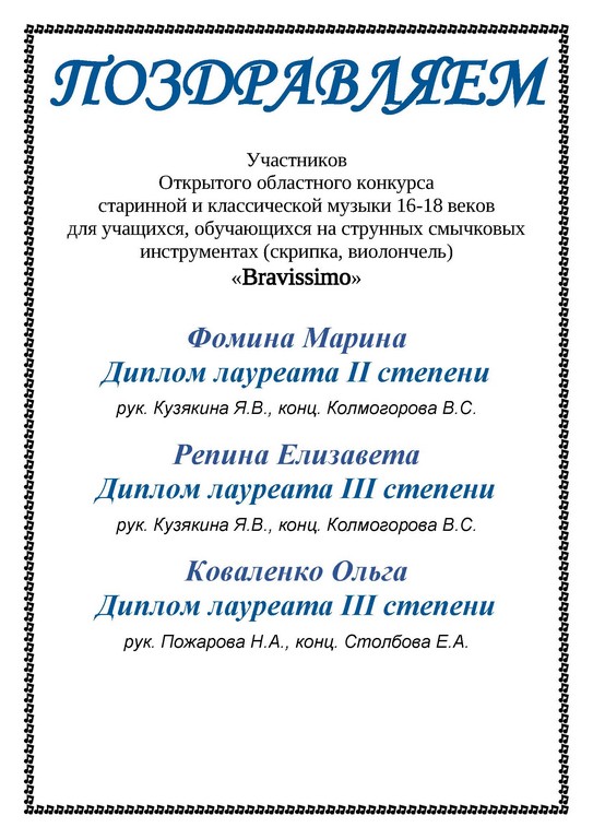 Борей Богдана(преп. Агеева Э.И), Чапурина Настя(преп. Багаутдинова Н.И.), Рыбакова Вика (преп. Ершова Т.А.), Пермяков Алеша (преп. Литвиненок А.Н.), Нагаев Назар(Шевченко Н.О), Чувашов Гоша (преп. Свиридов А.И.), Меньщиков Рома, Козлова Арина, Меньщиков Даниил, Ураков Кирилл (преп. Куцулима Е.Ю), Хлебникова Ксюша, Меньщикова Лиана, Балдиева Рина (преп. Естехина Л.П.), Касьянова Василиса, Касьянова Аня, Кретинин Рома (преп. Жидкова Ю.О.), Зобов Денис(преп. Устинов А.Б. ), Лежнина Саша, Прядеин Никита (преп. Миронова Т.Я.), Церковняк Арина, Гаранин Андрей (преп. Репьев Е.С.), Красноруцков Женя, Чувашов Коля (преп. Шмельков В.М.), Рыбачек Дарина, Космовская Настя, Гундырева Настя (преп. Лебедева А.А.), Сафин Айрат (преп. Ковшова И.В.)